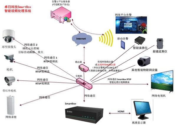 智能視頻分析系統(tǒng)(SmartBox)是卓目科技自主研發(fā)的針對(duì)視頻監(jiān)控領(lǐng)域智能化監(jiān)控的軟硬件一體化邊緣計(jì)算平臺(tái),可用于多場(chǎng)景下人、物及行為的識(shí)別。內(nèi)嵌安全帽佩戴識(shí)別、人臉識(shí)別、吸煙識(shí)別、區(qū)域入侵檢測(cè)等算法,并且支持音柱聯(lián)動(dòng)、球機(jī)跟蹤、數(shù)據(jù)上傳到客戶平臺(tái)等功能,廣泛應(yīng)用于“建筑樓宇、工業(yè)園區(qū)、能源電力”等領(lǐng)域,助力智慧安防。